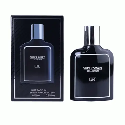 Super Smart Collection Eau de Parfum 102 – 25ml یک ادکلن مردانه کوچک و اقتصادی است که رایحهای مشابه Jaguar Classic Black ارائه میدهد. انتخابی عالی برای کسانی که به دنبال عطر قابل حمل با رایحه گرم و تند کلاسیک هستند.