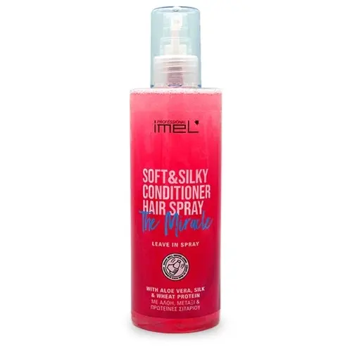 اسپری مو نرم کننده Imel با آلوئه ورا، ابریشم و پروتئین گندم. فرمول سبک، مخصوص انواع مو طراحی شده که موها را ترمیم، مرطوب و نرم و ابریشمی می کند. پروتئین های گندم و آلوئه ورا به ساقه مو نفوذ کرده و آن را تقویت می کند، سطح آب رسانی آن را بهبود می بخشد، موهایی نرم و براق می کند. آبکشی نکنید. بدون اینکه موها را سنگین کند.