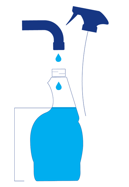 1 پس از خالی شدن اسپری حمام پاور اند شاین، نازل را باز کنید و بطری را تا خط مشخص شده با آب (680 میلی لیتر) پر کنید.